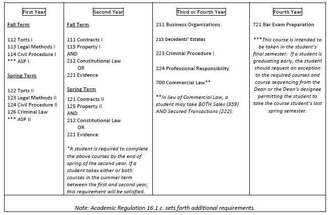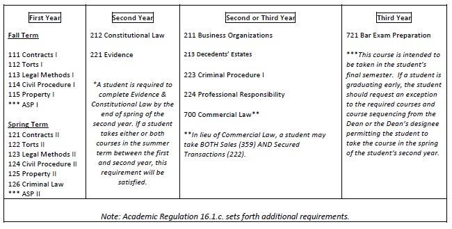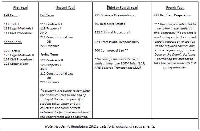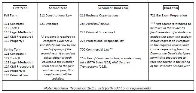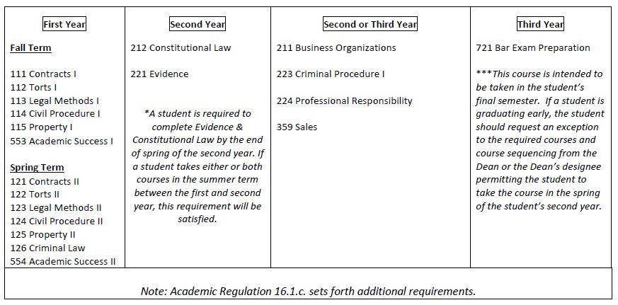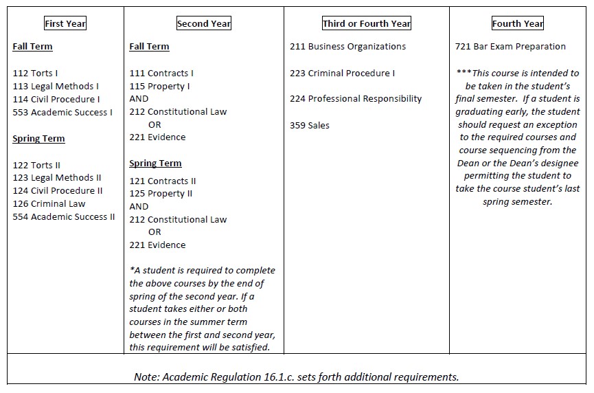 In addition to the above-listed courses, a student is required to satisfy both the advanced writing and the experiential requirements as outlined in Academic Regulation 16.1.c. Students on Academic Warning or Academic Probation may also be required to complete additional courses or take courses in a specific sequence as set forth in Academic Regulations 14.4 and 14.5.