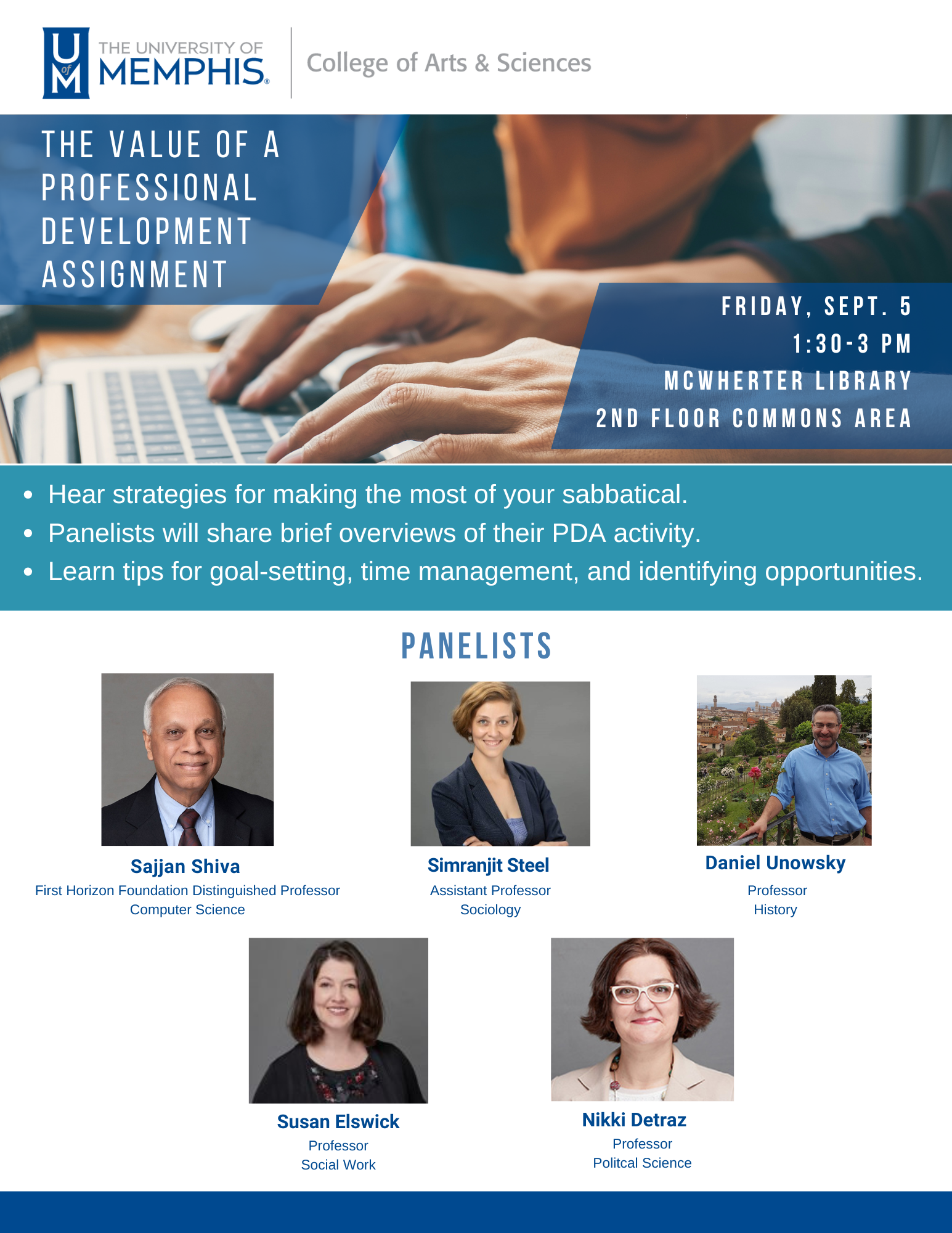Join us to hear strategies for making the most out of your sabbatical!  Panelists will share brief overviews of their PDA activities and offer tips for goal-setting, time management, and identifying professional development opportunities while on leave.