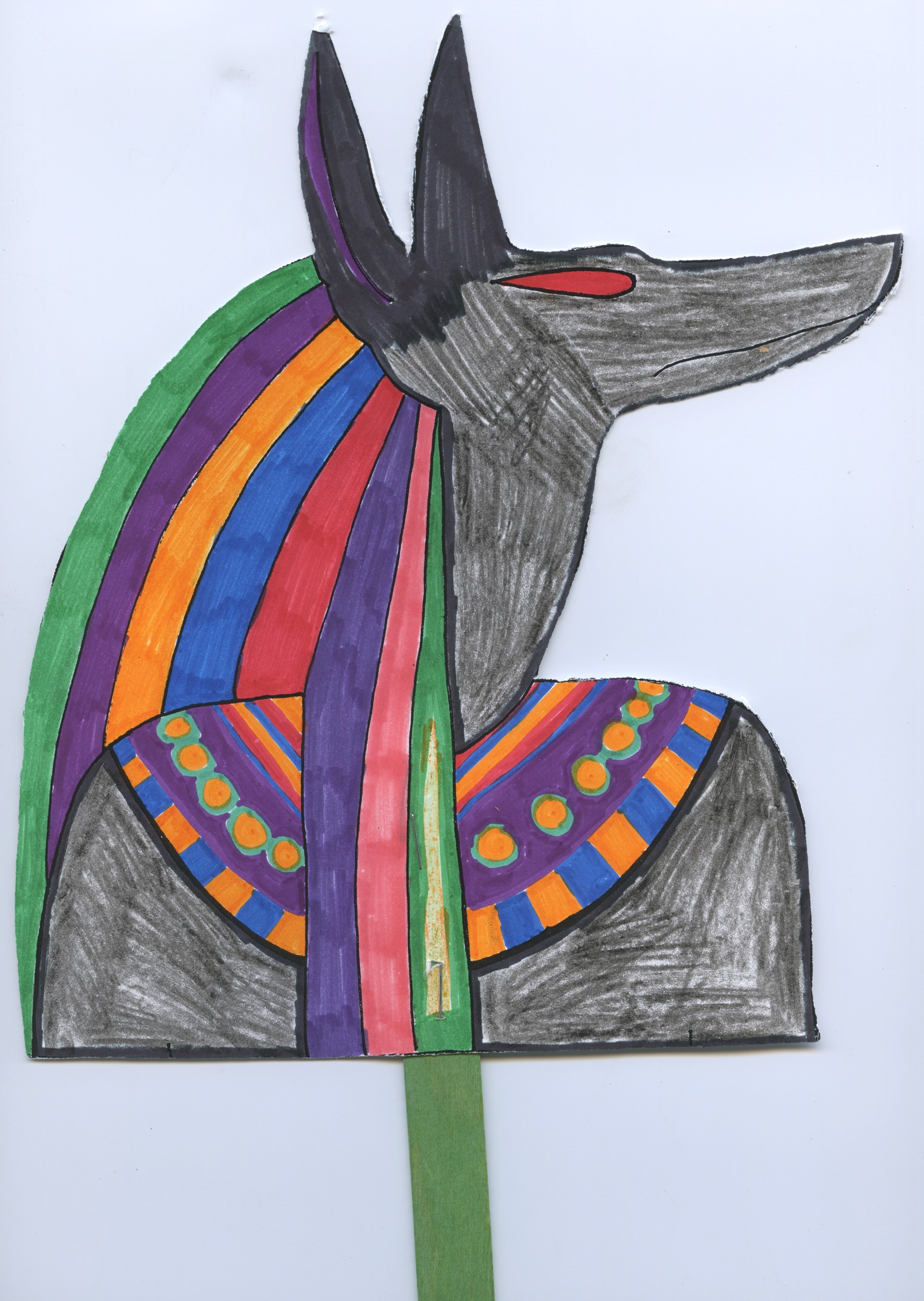 Color a mask of a popular Egyptian deity or Egypt's most well-known pharaoh. Gods in Egypt take on many different forms. Anubis is a jackal-headed god associated with death and burial. Bes is associated with the protection of children. Hathor, sometimes depicted as a cow, is the goddess of the sky, music, love, and motherhood. Sekhmet, a lioness-headed goddess, is associated with destruction and protection. Tutankhamun ruled as Pharaoh during the New Kingdom.