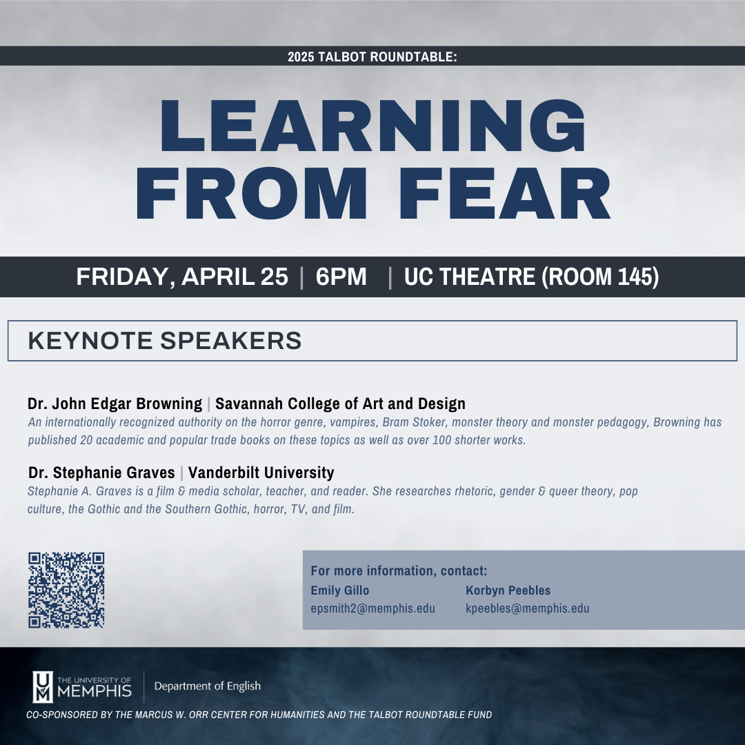 Each year, the University of Memphis English Department hosts a Graduate Student Conference in conjunction with the UofM English Graduate Organization (UMEGO). More information about the 2026 UMEGO Conference is forthcoming.
