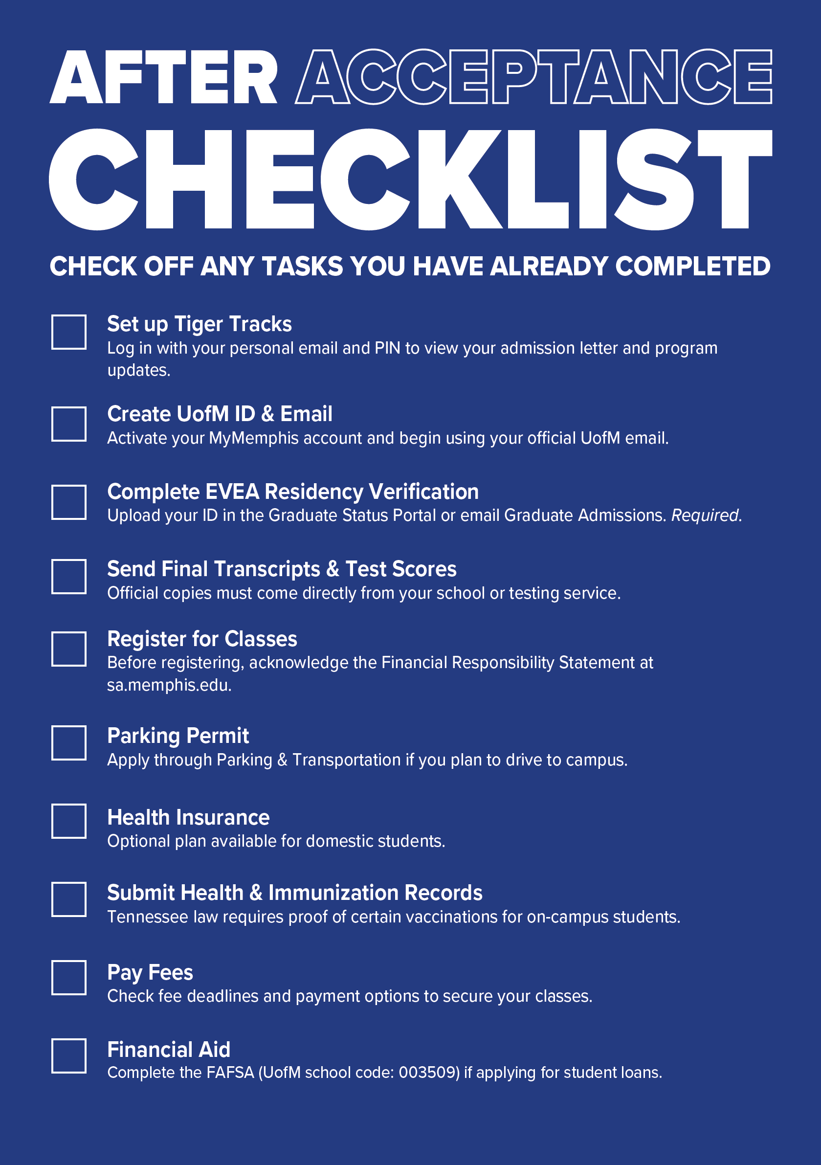 Congratulations! By now you should have received your official letter of acceptance, and a celebratory welcome package is already on its way to your mailbox. In the meantime, please visit the link below to view your next steps checklist and begin your journey with us.