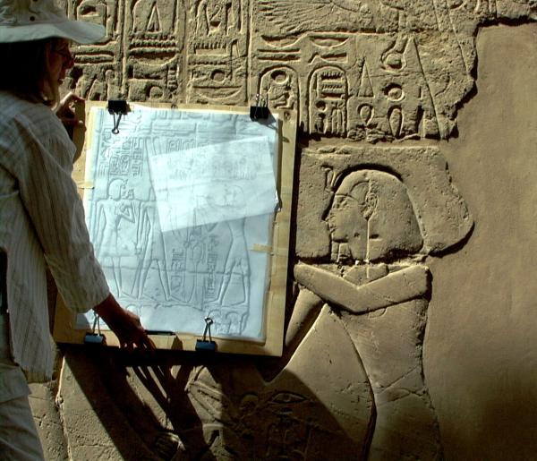 A term used by papyrologists and Medievalists to describe a document (papyrus or parchment) which has been recycled by washing off the original text for reuse, but leaving traces of the original behind. Egyptologists use the term to refer to the erasure of one set of inscriptions and its replacement by a new one. On the south wall of the Hypostyle Hall, the erasure of the Battle of Kadesh scenes was finished in plaster leaving many traces of after the new reliefs were carved over them.
