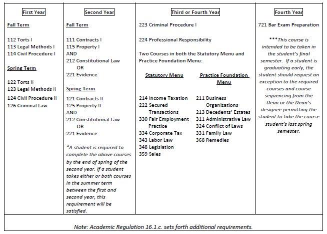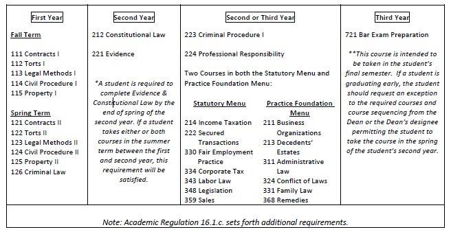 In addition to the above-listed courses, a student is required to satisfy both the advanced writing and the experiential requirements as outlined in Academic Regulation 16.1.c. Students on Academic Warning or Academic Probation may also be required to complete additional courses or take courses in a specific sequence as set forth in Academic Regulations 14.4 and 14.5.